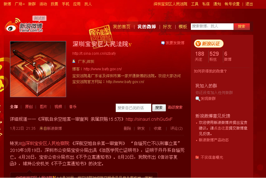 微博作为一个方便快捷的信息发布平台,有其无可比拟的实时性、现场感以及快捷性,已成为当今社会掌握资讯的重要平台。为进一步落实司法为民宗旨,加大司法公开力度,延伸司法服务触角,宝安法院顺应时代潮流,在全省法院系统率先开通官方微博,充分利用微博平台优势,及时发布法院工作动态,案件审判情况,法制宣传等内容。拓宽公众了解法院工作渠道,搭建民意沟通新平台。微博开通后,倍受社会各界关注,目前已经拥有近百人的关注量,深圳特区报、深圳商报等多家媒体对此进行了深度报道。截至目前,已经发表博文4篇,分别涉及法院工作举措、工作成效及热点案件处理情况,获得网友的大量好评及转载,有效增强了社会对法院工作的认同和支持。