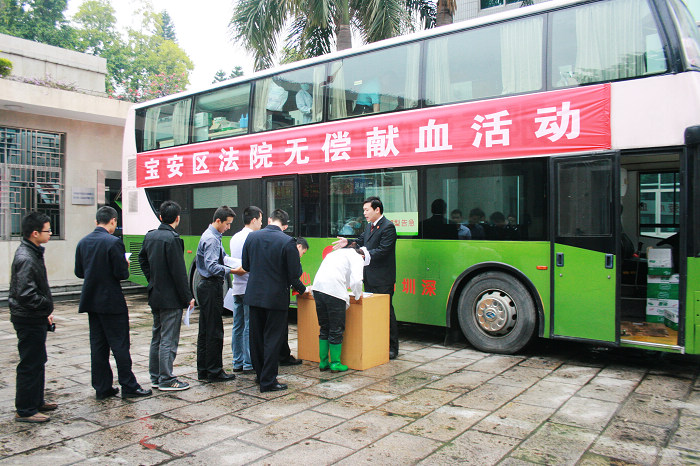 无偿献血活动是宝安法院开展的“献爱心公益活动”重要组成部分之一,同时也是法院文化建设的重要内容,已经成为宝安法院的优良传统,每年的无偿献血活动都获得广大干警的积极参与,无论是院领导还是青年干警,只要身体条件许可,都将无偿献血作为献爱心和履行公民义务的一项自觉行动。在连续四年的献血活动中,宝安法院干警参加无偿献血超过216人次,累计捐献血液超过46800毫升,大多数献血的干警都是连续四年参加。